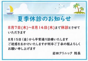 臨時休診のお知らせ 2025年8月20日 最終更新日時 : 2025年8月20日 phk87596 10月25日(土曜日) 臨時休診とさせていただきます ご迷惑をおかけして大変申し訳ございませんが宜しくお願い申し上げます 岩田クリニック 院長